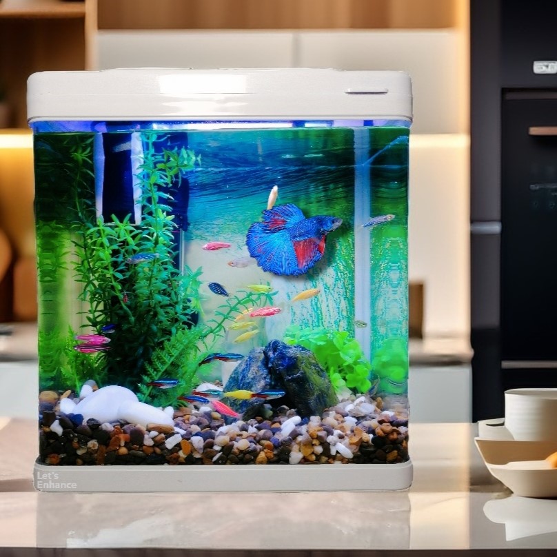 Наявність фільтрації забезпечує кришталево чисту воду у поєднанні з аерацією у вигляді справжнього водоспаду, світлодіодне підсвічування з дуже яскравими кристалами робить імітацію променів сонця у воді, сучасний дизайн і різна колірна гамма акваріума прикрасить будь-який інтер'єр.